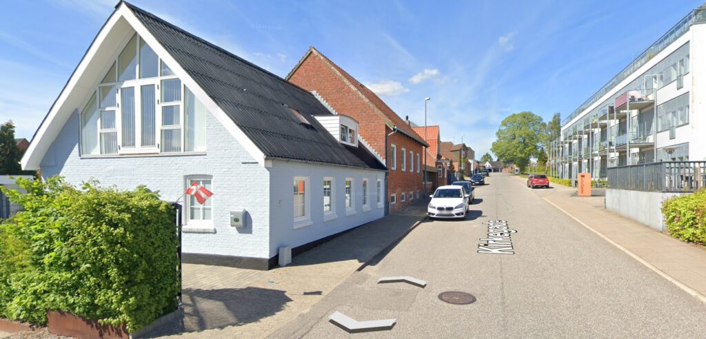 Men hvor er dette mageløse billede taget? Telefonmasten til venstre i billedet kunne tyde på, at telefoncentralen har ligget i nærheden. Den senere automatcentral lå i Kirkegade lidt nord for den hvide bil og selvom vinduet til højre i gavlen passer med vinduet på billedet herunder, blev de fleste vinduer fra den tid konstrueret på samme måde. Da bygningerne på billedet ovenfor ser ud til at vise en større gård, er det mindre sandsynligt at huset i forgrunden herunder er stuehuset i denne gård.